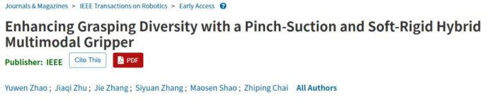 1.Yuwen Zhao, Jiaqi Zhu, Jie Zhang, Siyuan Zhang, Maosen Shao, Zhiping Chai, Yimu Liu, Jianing Wu*, Zhigang Wu*, Jinxiu Zhang*,Enhancing Grasping Diversity with a Pinch-Suction and Soft-Rigid Hybrid Multimodal Gripper. IEEE Transactions on Robotics. DOI: 10.1109/TRO.2025.3577014