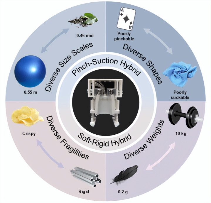 近期,中山大学张锦绣教授、吴嘉宁副教授与华中科技大学吴志刚教授联合团队开发了一种刚柔耦合的、具有捏吸功能的混合多模式抓手(HMG,Hybrid Multi-mode Gripper)。