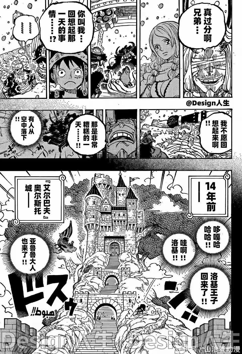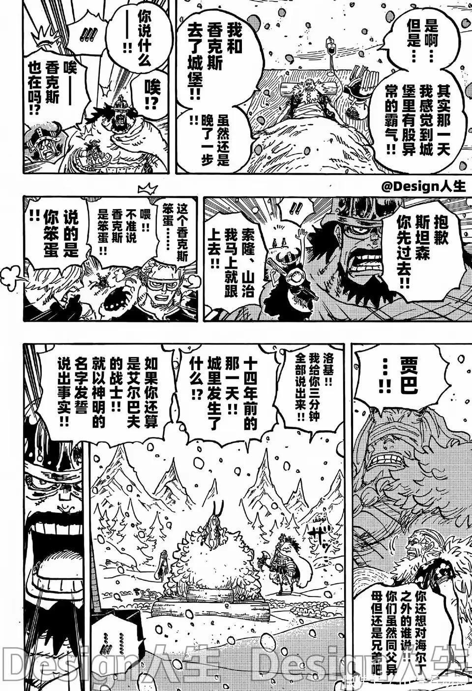 14年前,洛基王子杀死了国王和一百多名战士,其实这是诬陷洛基王子的,当年贾巴和红发香克斯也在艾尔巴夫,他们发现了异常的霸王色霸气,等他们进入城堡里发现太迟了,国王已经死了。山治和索隆跟着巨人族战士回去,海尔丁和路飞留下来,他给了洛基王子三分钟说出真相。