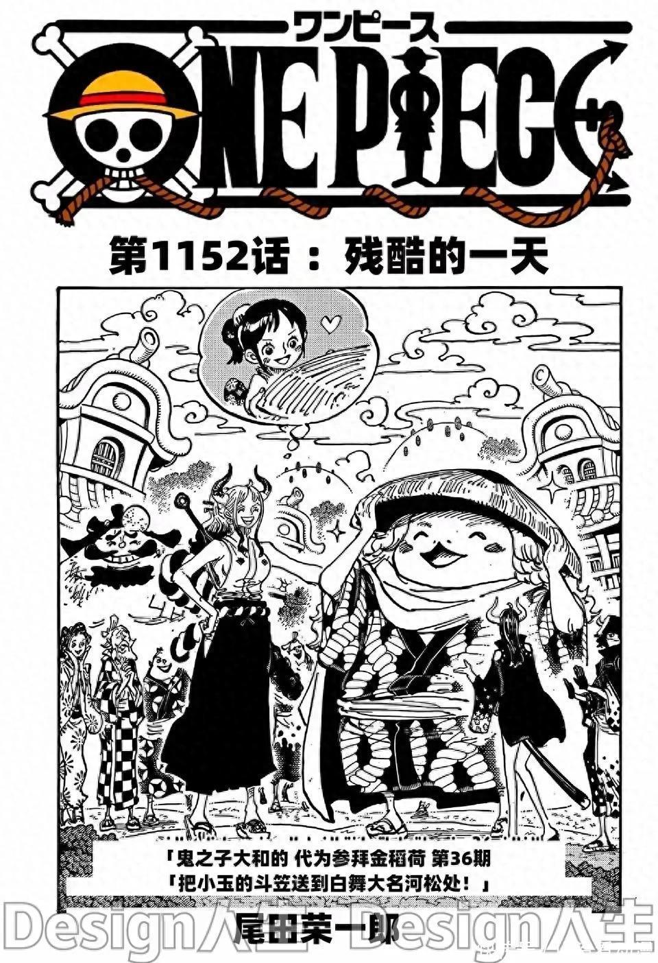 漫画1152话的标题是残酷的一天,扉页小故事是大和把斗笠送给河松,小玉的礼物,乌尔缇和佩吉万也在这里,他们会一直跟随大和。巨人族战士要前往冥界,葛露兹留在这里,乔巴也留下来照顾贾巴,贾巴喊住了路飞,他有话对路飞说。